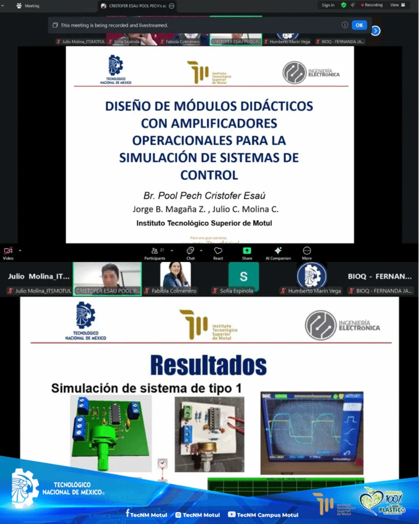 “Diseño de módulos didácticos con amplificadores operacionales”, a cargo del Br. Cristofer Esaú Pool Pech con los Mtros. Jorge Magaña Zaldívar y Julio César Molina. “Cerradura inteligente para exteriores basada en ESP32”, por los alumnos Jonathan Asís Herrera y José Gabriel Chale, junto al Mtro. Luis Jorge Azcorra.